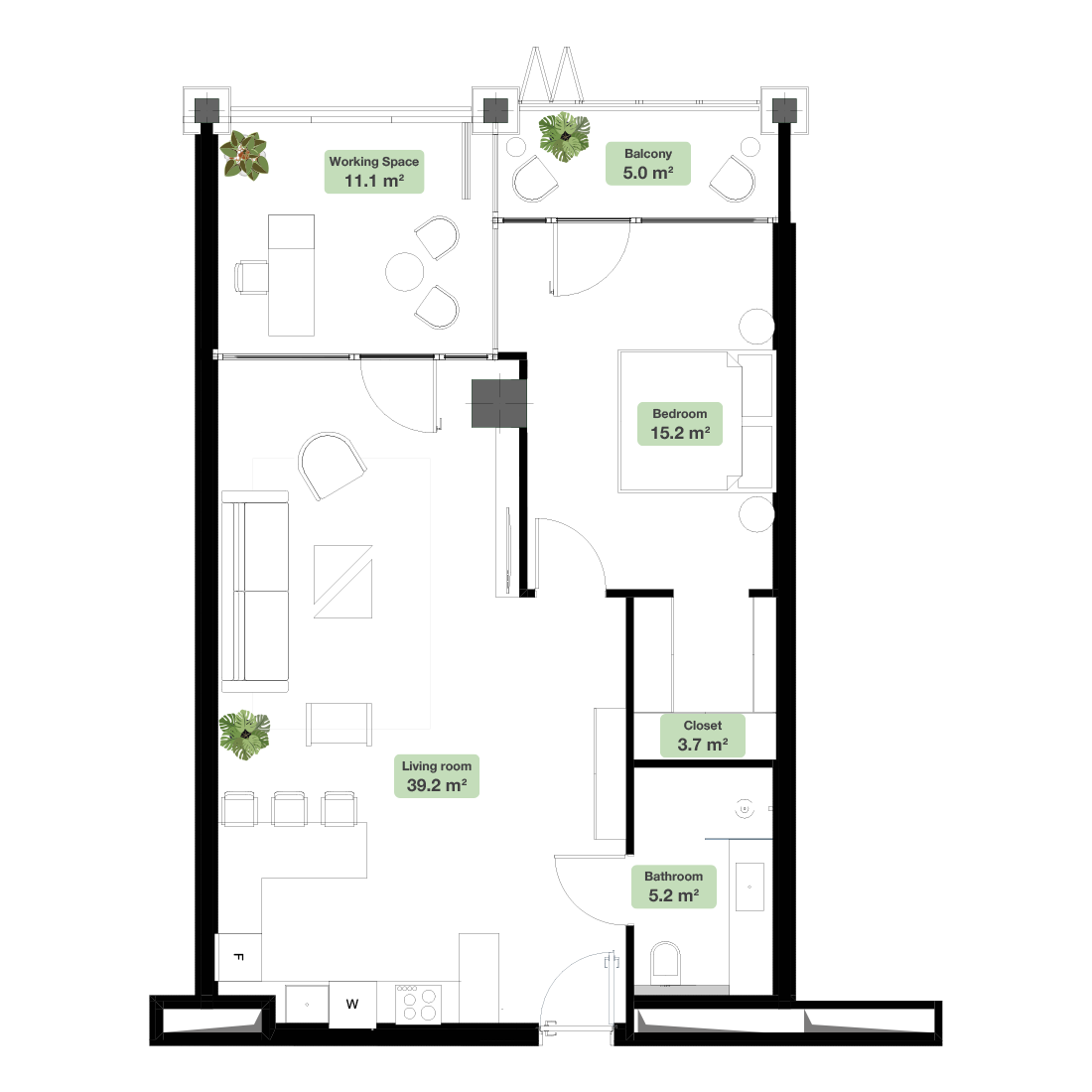 • 3.45 მეტრი ჭერის სიმაღლე ბინებში