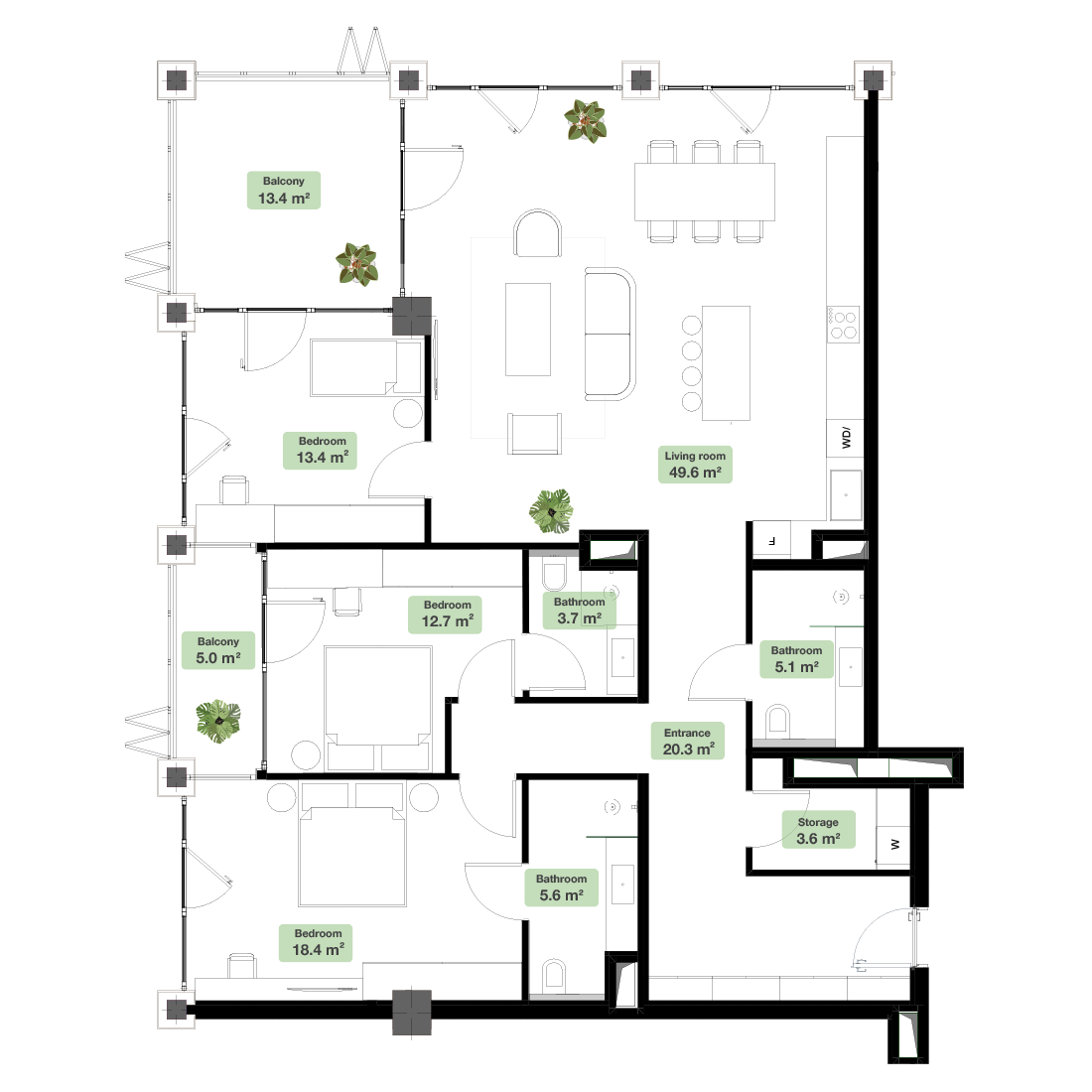 • 3.45 მეტრი ჭერის სიმაღლე ბინებში