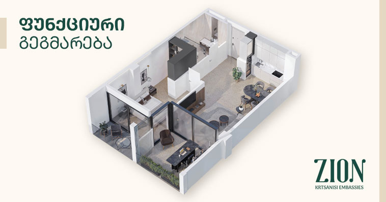 თანამედროვე ადამიანის ცხოვრების რიტმი და საჭიროებები ფუნდამენტურად შეცვლილია. მათ სჭირდებათ სივრცე, სადაც საყვარელ საქმესთან და იდეებთან განმარტოვდებიან. „ზიონის“ არქიტექტურულად გააზრებული გადაწყვეტა მომხმარებელს სწორედ ამ საჭიროებას უვსებს. ჩვენ შევქმენით ვიტრაჟული, ნათელი და შთამაგონებელი გარემო, სადაც მაცხოვრებელს შეუძლია, მოაწყოს თავისი ინტერესების სამყარო. ასეთი დაგეგმარება პირდაპირ პასუხობს ჰიბრიდული და დისტანციური მუშაობის რეალობას, სადაც დამოუკიდებელი სივრცე არა ფუფუნება, არამედ აუცილებლობაა.
